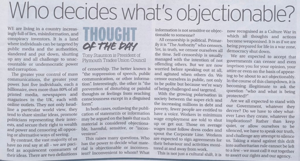 This article, edited, was the follow-up to my column on the War on Gaza that was stopped from being printed on 10th October on the grounds that some readers would find it objectionable. The daily Plymouth Herald printed this as my weekly column the following week, on the 17th, aware of my complaints about their censorship, and, I’m grateful to acknowledge, a number of letters to the paper complaining on my behalf. We really do have to keep challenging authority!