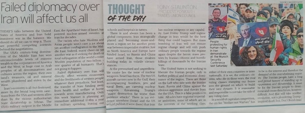 Failed diplomacy over Iran will directly affect western economies and the livelihoods of western people whatever their prejudices. We are no longer living in the 1980’s, today’s military tensions far higher than for two generations past. Not least, the transfer of State funding away from health and welfare at home towards arms manufacturing. Only this week Starmer is planning an additional £14bn a year for military spending, leaving our schools and hospitals in tatters.