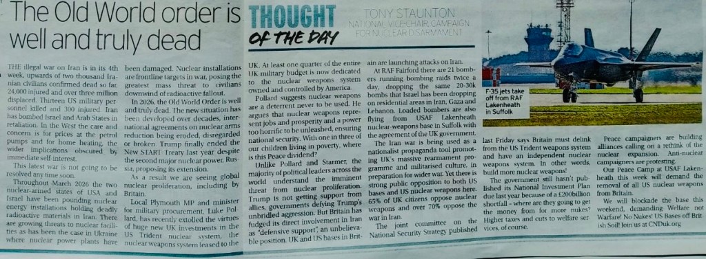 My weekly comment column in the daily Plymouth Herald (31.3.26) advertising next weekend’s mass blockade of US Air Force base at Lakenheath, Suffolk where US Bombers, fully armed, are taking-off to drop pay-loads on Iranian civilians in an illegal war. You’d think Starmer’s Government and our local MP Luke Pollard would be more embarrassed. Instead, they promote the drive towards nuclear war. Sickening. Inhuman. Detestable. Pandering to their rich imperialist paymasters.