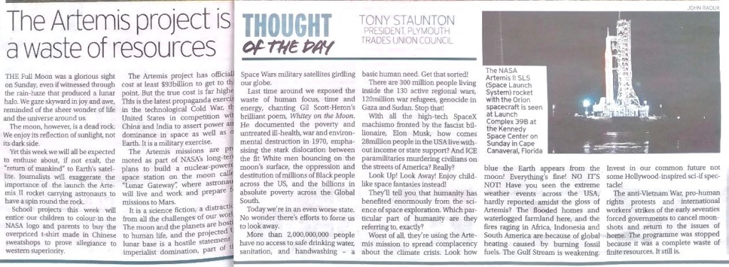 My weekly comment column in the daily Plymouth Herald (10.3.26) ensuring a statement against the bombing of Iran and identifying some of the dangers of US imperialism. Most essentially, the need to protest. Right now 56% of UK voters (and 51% of US voters – none of whom read this(!)), oppose Trump’s murderous illegal bluster, and we must ensure their views are seen on the streets and in the media. If all that is seen is BBC pro-war nonsense and far-right media memes, populations will shift into acceptance of war economies and war ideology. “Protest and Survive” as the old saying goes!
