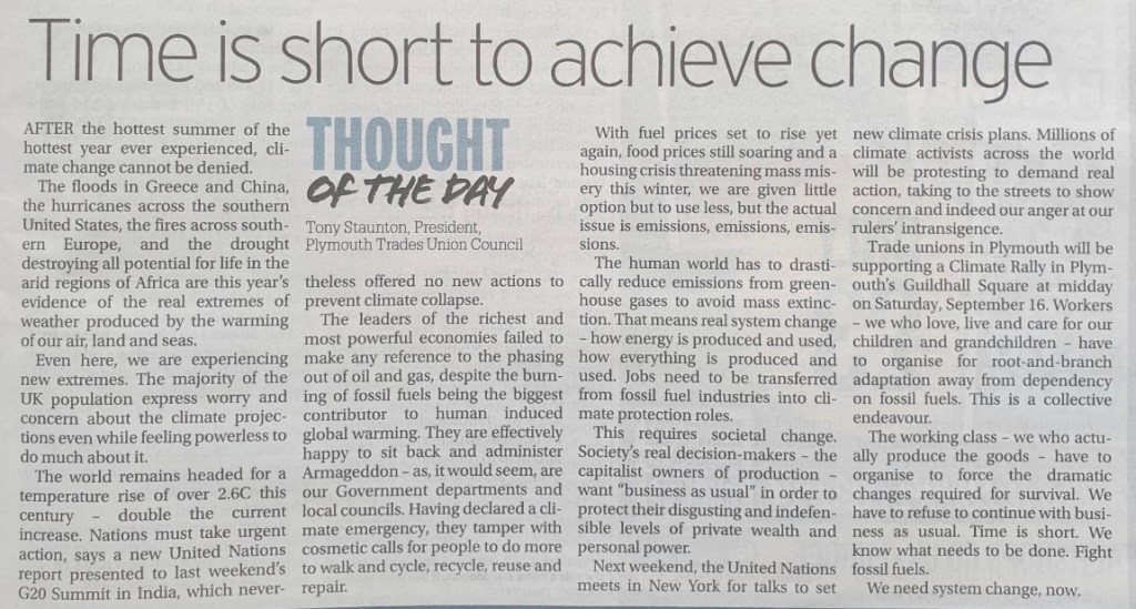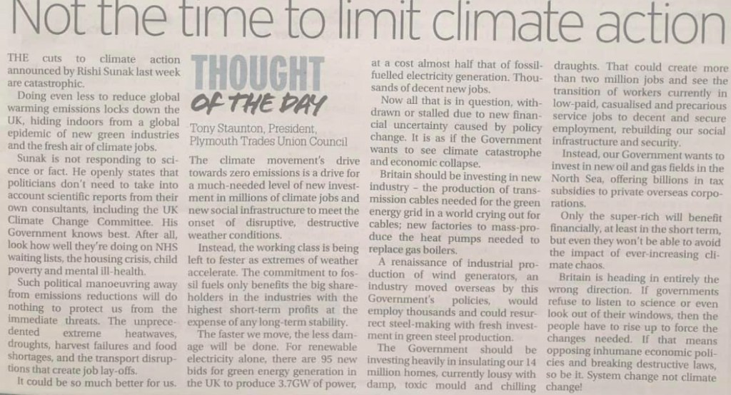Only a mass movement for mass investment, threatening the Vote, will force the political change needed. Only the wealthy can deny the need, even tho’ they, too, will face the social collapse as the climate system fragments. And trade unions have the collective power in workplaces to demand adaptation at an industrial level. It’s time to act!