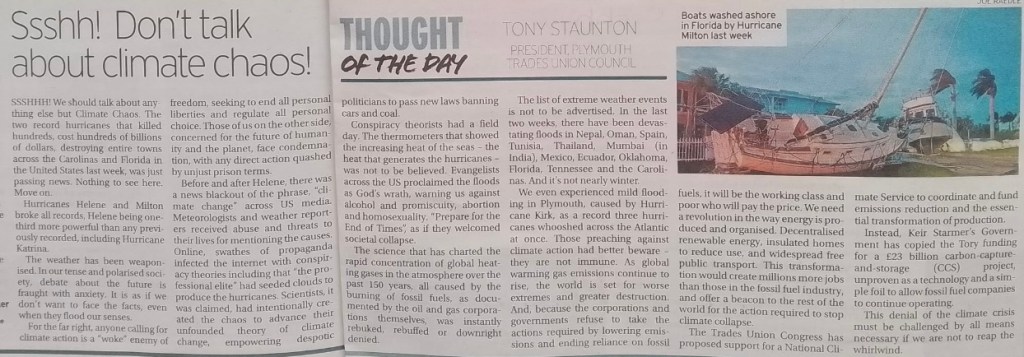 My weekly comment in the daily Plymouth Herald (4.11.25) continuing to expose the hypocrisy and corruption of tax-funding the capitalist climate chaos. The climate denial is orchestrated, massively funded and coordinated across the global capitalist ruling class. They may be raising war against each other, but they combine against any and all opposition to their acquisitive lust for accumulation of personal wealth. Little matters like climate collapse with billions of ordinary people displaced and dying cannot get in the way of this anti-human system of competition and destruction.