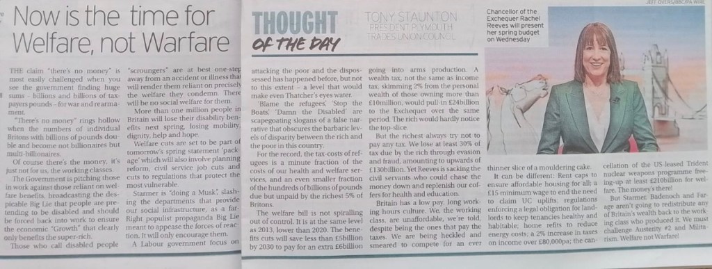My weekly comment column in the daily Plymouth Herald (25.3.25), raving mad about the benefits cuts. This is an attack on the poorest and most vulnerable in society, grabbing-back cash wherever possible to fund rearmament and war. This is militarism and authoritarianism, and must be defeated. We shall protest, demonstrate, campaign and oppose.