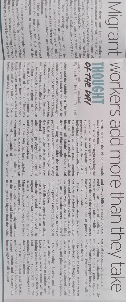My weekly Comment in the daily Plymouth Herald (18.11.25), seriously outraged by the latest racist policy drive of the UK so-called Labour government. Writing on Sunday for a Monday morning deadline, the article could not consider the later praise heaped-upon Home Secretary Shabana Mahmoud by the Tory Badenoch and Reform UK’s Farage. Most notably the fascist Yaxley-Lennon (aka Tommy Robinson) claimed a victory over the government, won by street protest and flag-hanging he boasted. Of course, the open racists bay for more – the more you give the more they demand – arguing for the withdrawal from the European Convention on Human Rights. And of course, the few Labour backbenchers raising concerns are too few and too whimpy to have any effect on the coming Commons vote. Starmer emptied-out the Labour Party of the entire Left – there’s no-one to call-out Mahmoud’s reactionary anti-human bile.