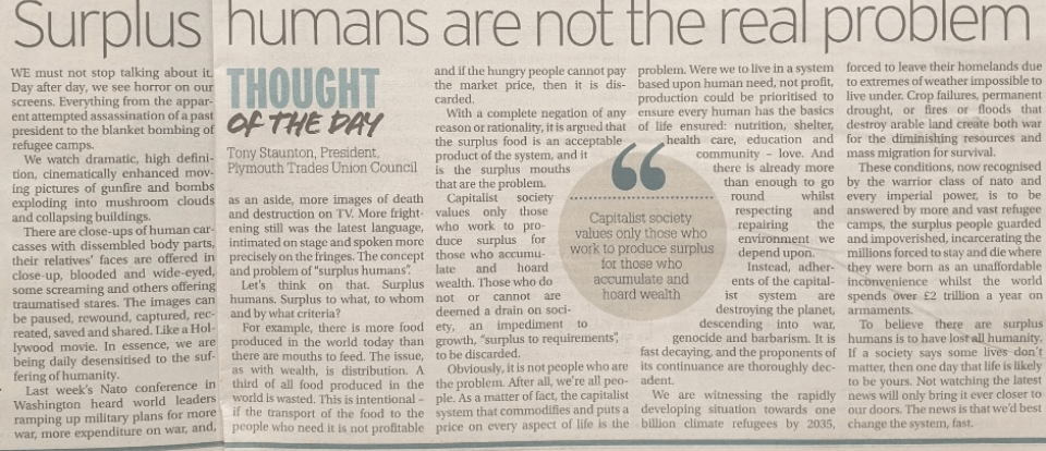 This has to be turned over. The world is in a crisis caused by capitalism. The descent into barbarism is sensed by all: the billionaire-backed rise of fascist organisation across the West; the forever wars and genocide pursued by the profiteering arms manufacturers; the climate catastrophe the result of the record profits from fossil-fuel emissions creating extreme weather events that force hundreds of millions from the homelands.