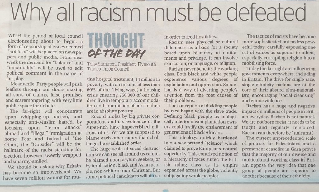 My weekly comment column in the daily Plymouth Herald (13.01.2026) making the links between ICE in the USA and the political direction of travel in the UK. It’s obvious really. If you agree, please build the largest ever anti-racist/anti-fascist protest in London on 28th March. You have time to recruit at least 10 of your colleagues and friends, through patient explanation and exposure of the implications of a far-Right government in Britain by 2029.