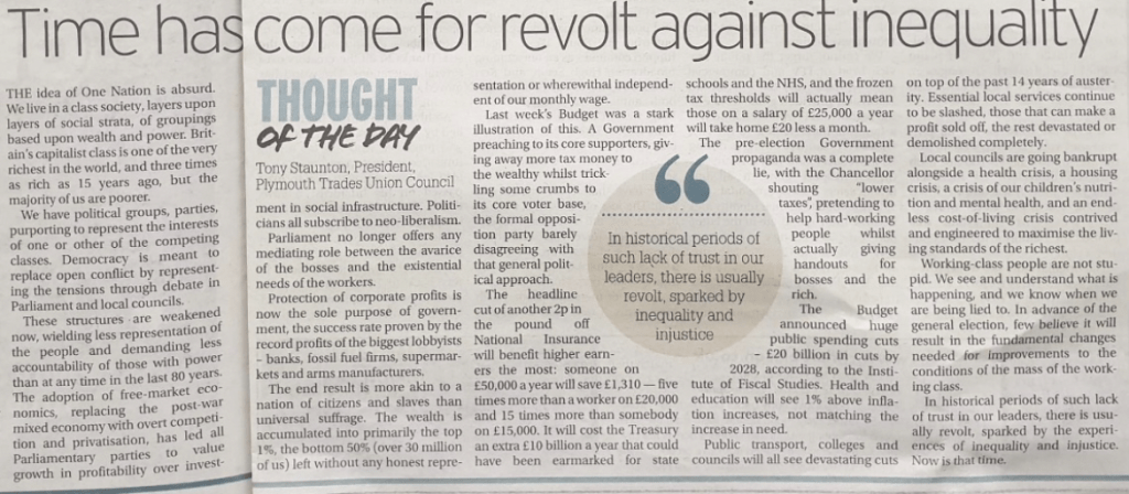 My weekly comment column in the daily Plymouth Herald (7.10.25), challenging the Police powers in relation to protest. In particular, whilst there is no universally agreed definition of discretion given to Police as agents of the Capitalist State machine places democracy and all of us individually in danger. We must oppose, we must protest for the right to protest.